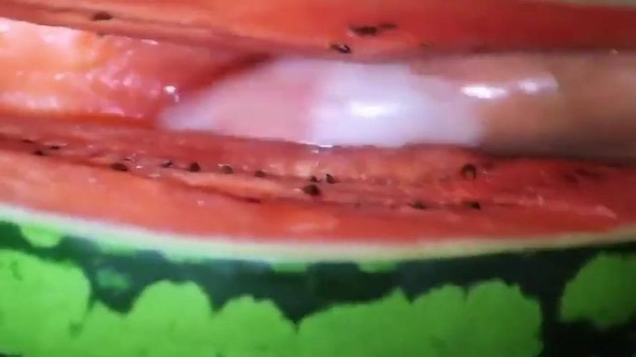 תיאור: eating and playing with cum after fucking a melon and cumming into a condom