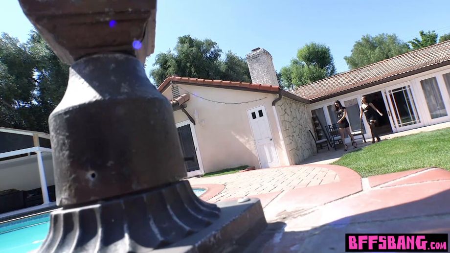 説明 : Classy brunette besties with big boobs in fancy black lingerie with stockings use their fit bodies and tight pussies to serve and satisfy their big cock client by the pool outdoor The bisexual sluts licking each other cunts during the dude fucks them