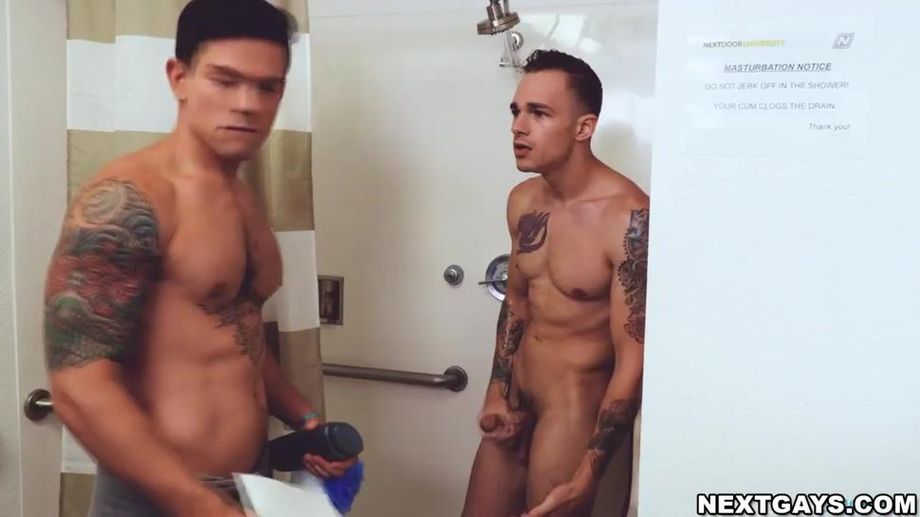 คำอธิบาย : Dakota Payne cant believe the notice hanging on his dorm bathroom wall. The dorm pipes are clogged thanks to so many dudes jerking off in the shower. Dakota is stressed! When he sees dorm-mate Jayden Marcos, he knows the answer.